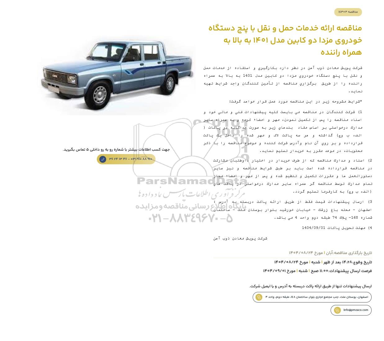 شرکت پویش معادن ذوب آهن در نظر دارد بکارگیری و استفاده از خدمات حمل و نقل با پنج دستگاه خودروی مزدا دو کابین مدل 1401 به بالا به همراه راننده را از طریق برگزاری مناقصه از تأمین کنندگان واجد شرایط تهیه نماید.