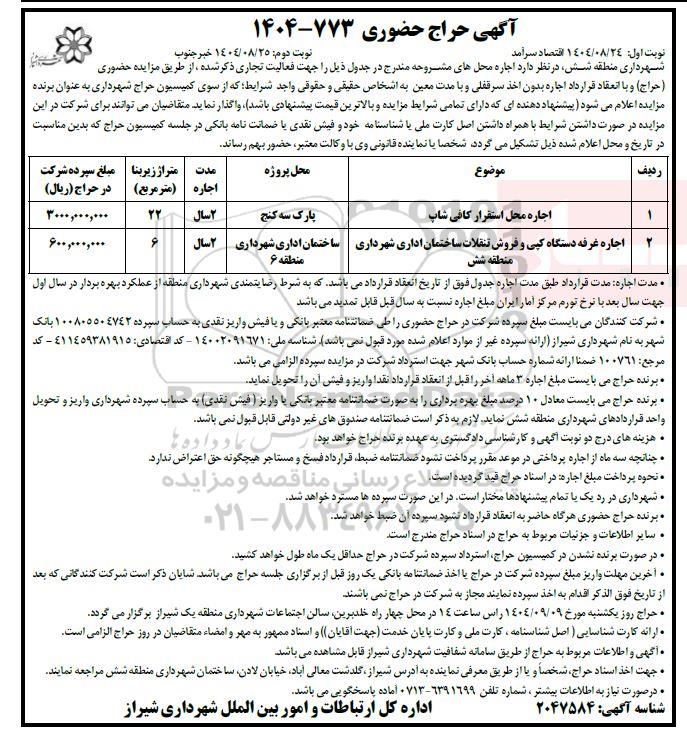 شهرداری منطقه شش ، در نظر دارد اجاره محل های مشروحه مندرج در جدول ذیل را جهت فعالیتهای تجاری ذکر شده، از طریق مزایده حضوری (حراج) و با انعقاد قرارداد اجاره بدون اخذ سرقفلی و با مدت معین به اشخاص حقیقی و حقوقی واجد شرایط ؛ که از سوی کمیسیون حراج شهرداری بعنوان برنده مزایده اعلام  میشود (پیشنهاد دهنده ای که دارای تمامی شرایط مزایده و بالاترین قیمت پیشنهادی بوده باشد)، واگذار نماید. متقاضیان میتوانند برای شرکت در این مزایده درصورت داشتن شرایط با همراه داشتن کارت ملی یا شناسنامه خود و فیش نقدی یا ضمانت نامه بانکی در جلسه کمیسیون حراج که بدین مناسبت درتاریخ و محل اعلام شده ذیل تشکیل میگردد، شخصا یا نماینده قانونی وی حضور بهم رساند .