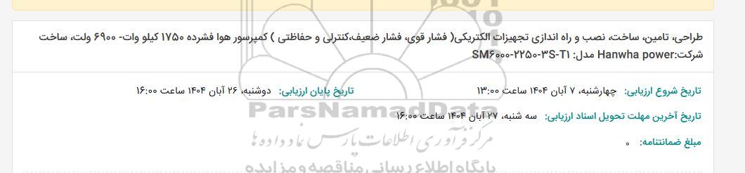 طراحی، تامین، ساخت، نصب و راه اندازی تجهیزات الکتریکی (فشار قوی، فشار ضعیف، کنترلی و حفاظتی) کمپرسور هوا فشرده 1750 کیلو وات - 6900 ولت، ساخت شرکت: Hanwha power مدل: SM6000-2250-3S-T1