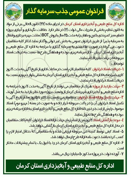 اداره کل منابع طبیعی و آبخیزداری استان کرمان در اجرای ماده (27) قانون الحاقی برخی از مواد به قانون تنظیم بخشی از مقررات مالی دولت (2) در نظر دارد حفاظت، نگهداری و آبیاری پروژه فضای سبز کمربندی باغین و ماهان را به مدت 25 سال با روش BOT (ساخت، بهره برداری و انتقال به سرمایه پذیر) از طریق فراخوان عمومی به بخش غیر دولتی واگذار نماید. لذا از کلیه متقاضیان دعوت میگردد در صورت علاقمندی به سرمایه گذاری با مراجعه به اداره کل منابع طبیعی و آبخیزداری استان کرمان - اداره برنامه ریزی ، بودجه و هماهنگی طرح ها - نسبت به دریافت اسناد مربوطه در مهلت مقرر اقدام نمایند.