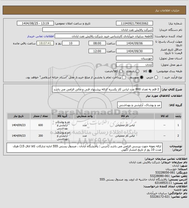 شرح کلی نیاز: 2 قلم به تعداد 800 عدد لباس کار یکسره /ارائه پیشنهاد فنی و مالی الزامی می باشد