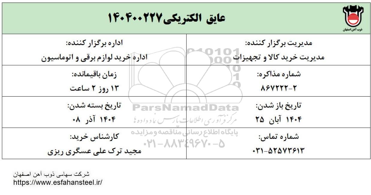 اداره برگزار کننده: اداره خرید لوازم برقی و اتوماسیون |