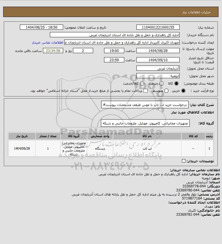 شرح کلی نیاز: درخواست خرید لب تاپ با موس طبقف مشخصات پیوست#