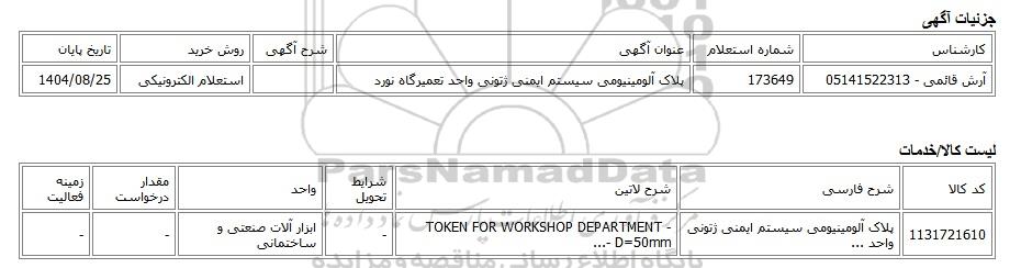 آرش قائمی - 05141522313173649پلاک آلومینیومی سیستم ایمنی ژتونی واحد تعمیرگاه نورداستعلام الکترونیکی1404/08/25