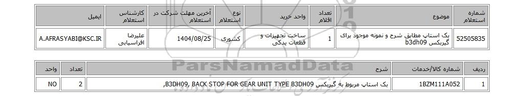 | 52505835 | بک استاپ مطابق شرح و نمونه موجود برای گیربکس b3dh09 | 1 | ساخت تجهیزات و قطعات یدکی | کشوری | 1404/08/25 | علیرضا افراسیابی | A.AFRASYABI@KSC.IR |