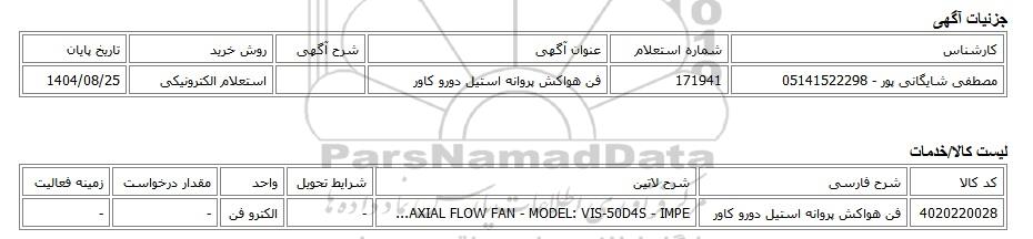 | مصطفی شایگانی پور - 05141522298 | 171941 | فن هواکش پروانه استیل دورو کاور | استعلام الکترونیکی | 1404/08/25 |