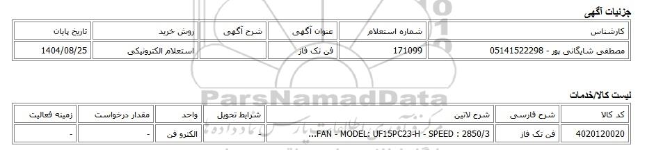 | مصطفی شایگانی پور - 05141522298 | 171099 | فن تک فاز | استعلام الکترونیکی | 1404/08/25 |