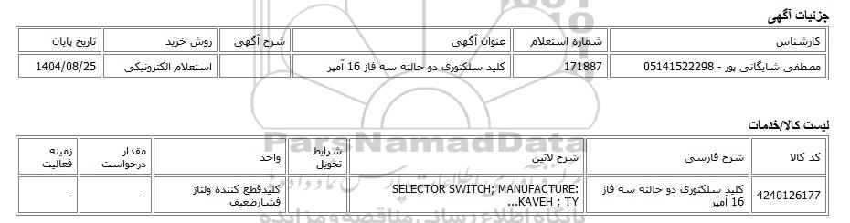 مصطفی شایگانی پور - 05141522298171887کلید سلکتوری دو حالته سه فاز 16 آمپراستعلام الکترونیکی1404/08/25