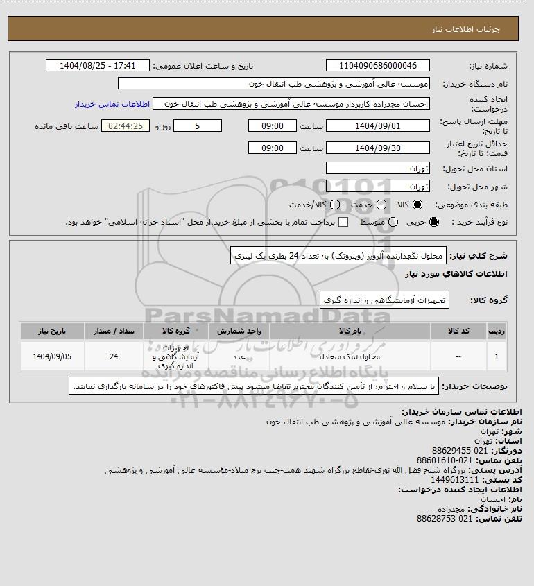 شرح کلی نیاز: محلول نگهدارنده آلزورز (ویتروتک) به تعداد 24 بطری یک لیتری