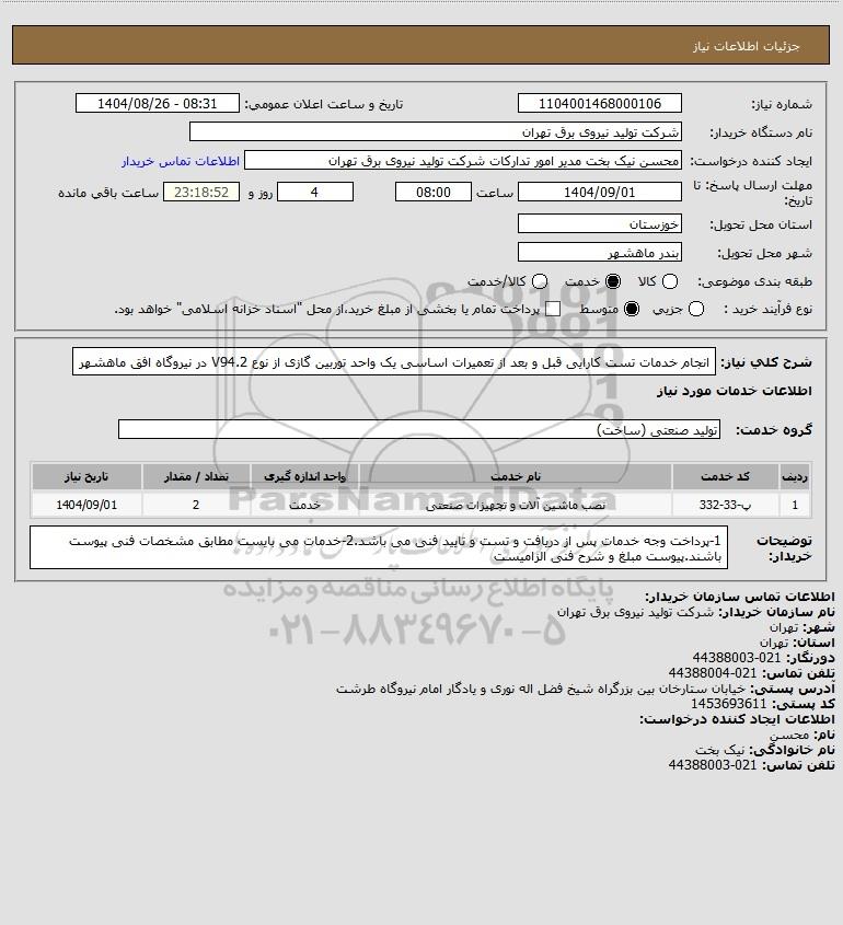 شرح کلی نیاز: انجام خدمات تست کارایی قبل و بعد از تعمیرات اساسی یک واحد توربین گازی از نوع V94.2 در نیروگاه افق ماهشهر