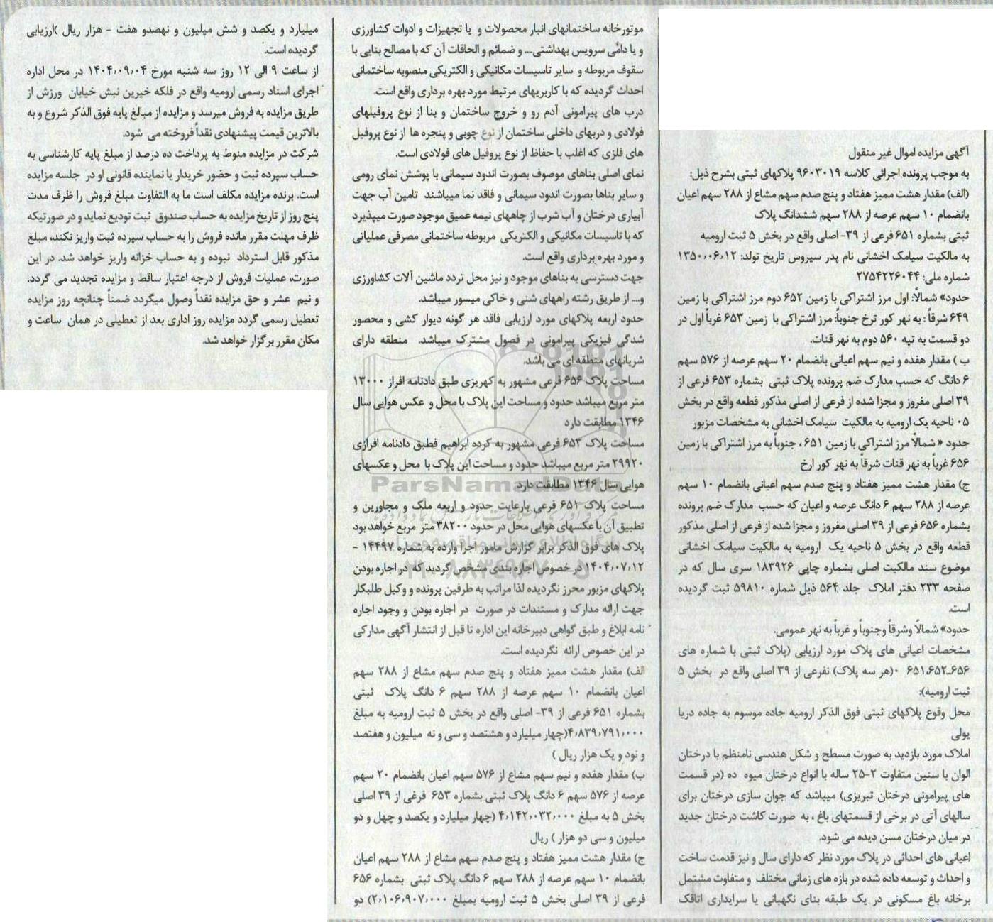 الف) مقدار هشت ممیز هفتاد و پنج صدم سهم مشاع از 288 سهم اعیان بانضمام 10 سهم عرصه از 288 سهم 6 دانگ پلاک ثبتی بشماره 651 فرعی از 39 اصلی واقع در بخش 5 ثبت ارومیه به مبلغ 4.839.791.000 (چهار میلیارد و هشتصد و سی و نه میلیون و هفتصد و نود و یک هزار ریال)