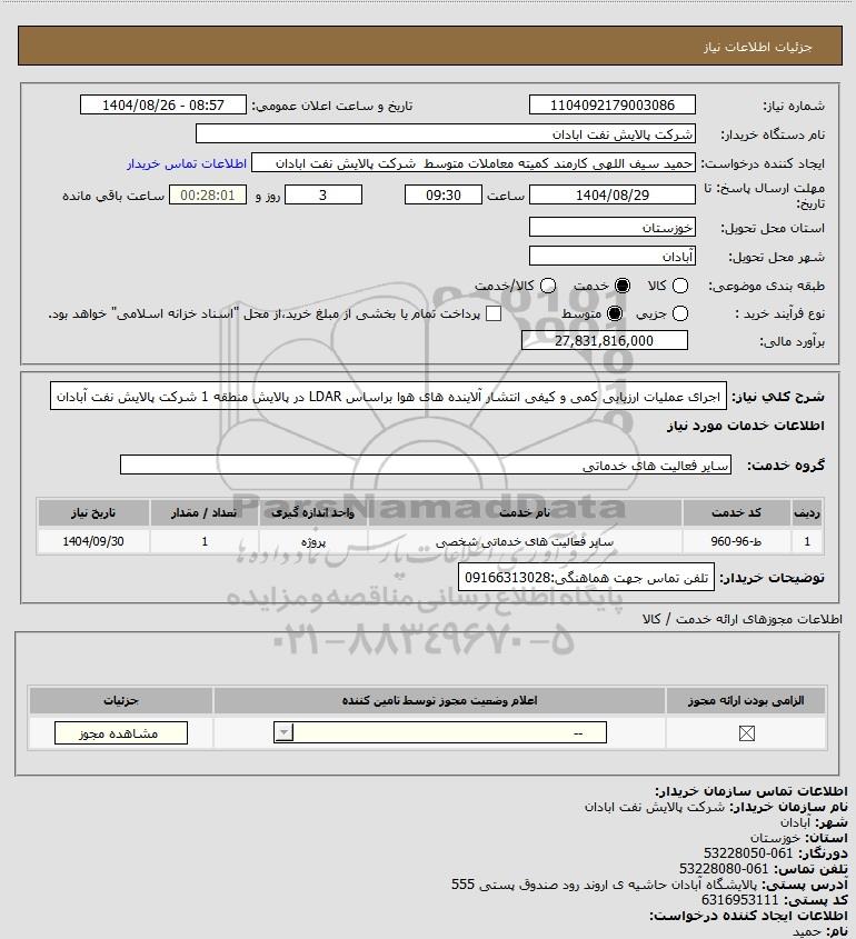 شرح کلی نیاز: اجرای عملیات ارزیابی کمی و کیفی انتشار آلاینده های هوا براساس LDAR در پالایش منطقه 1 شرکت پالایش نفت آبادان