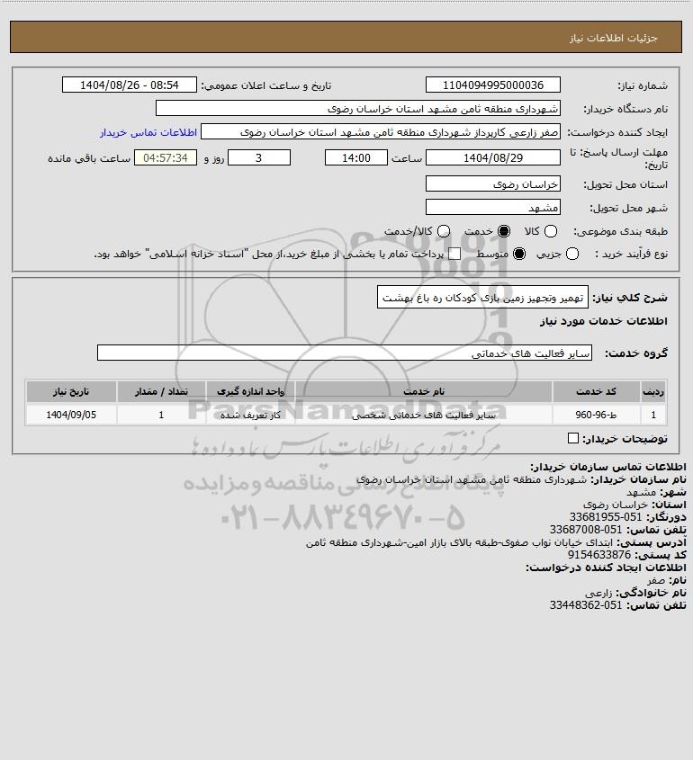 شرح کلی نیاز: تهمیر وتجهیز زمین بازی کودکان ره باغ بهشت