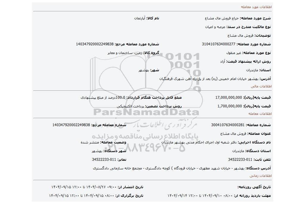| شرح مورد معامله: حراج فروش مال مشاع | نام کالا: آپارتمان | |