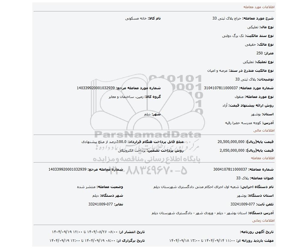 | شرح مورد معامله: حراج پلاک ثبتی 33 | نام کالا: خانه مسکونی | |
