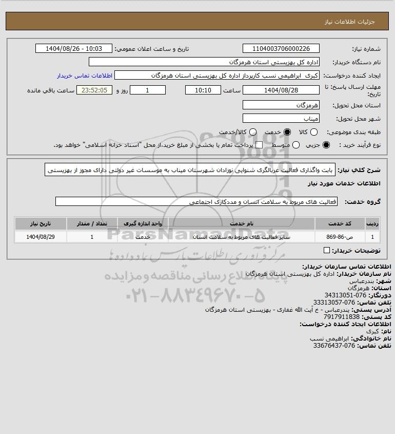 شرح کلی نیاز: بابت واگذاری فعالیت غربالگری شنوایی نوزادان شهرستان میناب به موسسات غیر دولتی دارای مجوز از بهزیستی