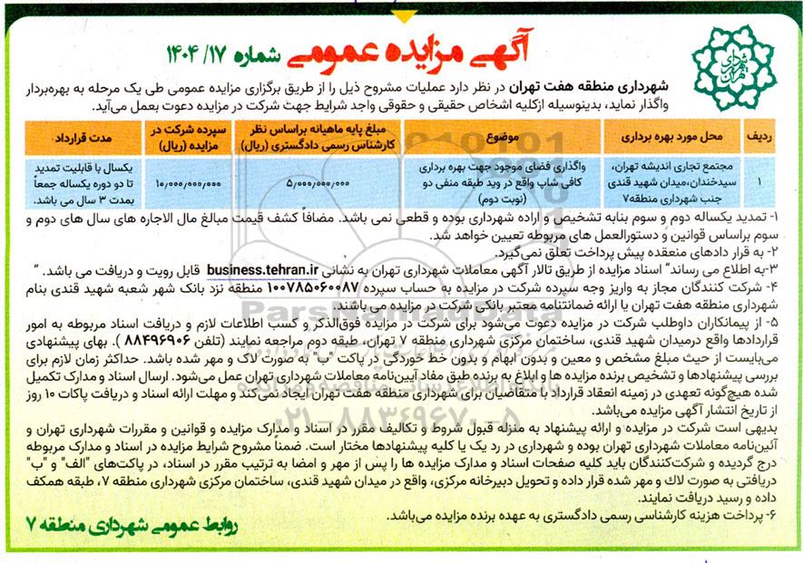 شهرداری منطقه هفت تهران در نظر دارد عملیات مشروح ذیل را از طریق برگزاری مزایده عمومی طی یک مرحله به بهره بردار واگذار نماید، بدینوسیله از کلیه اشخاص حقیقی و حقوقی واجد شرایط جهت شرکت در مزایده دعوت بعمل می آید.