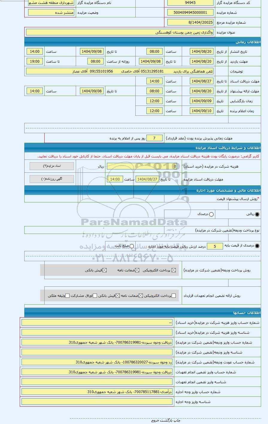 شماره مورد اجاره5104094945000001نوع برگزاری مزایده مزایده عمومی