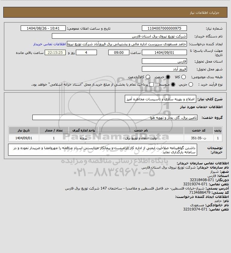 استعلام بها و موضوع استعلام استعلام اصلاح و بهینه سازی و تاسیسات مخاطره آمیز به اطلاع کلیه شرکتها و افراد متخصص واجد شرایط میرساند، آگهی گذار در نظر دارد از طریق استعلام بها، نسبت به انتخاب و دریافت پیشنهادات اقدام نماید. این استعلام با کد آگهی ثبت شده در سامانه خبرگزاری پارس نماد : 9864342 منتشر شده است. مشخصات استعلام : تاریخ شروع استعلام: 1404/08/26 آخرین مهلت ارسال پیشنهاد قیمت : 1404/09/01 و محل اجرای پروژه : استان فارس میباشد. استعلام قیمت مورد درخواست : استعلام اصلاح و بهینه سازی و تاسیسات مخاطره آمیز با دستهبندیهای تخصصی و گروه های مرتبط : پیمانکاری برق و الکترونیک, استعلام اطلاع رسانی میگردد.