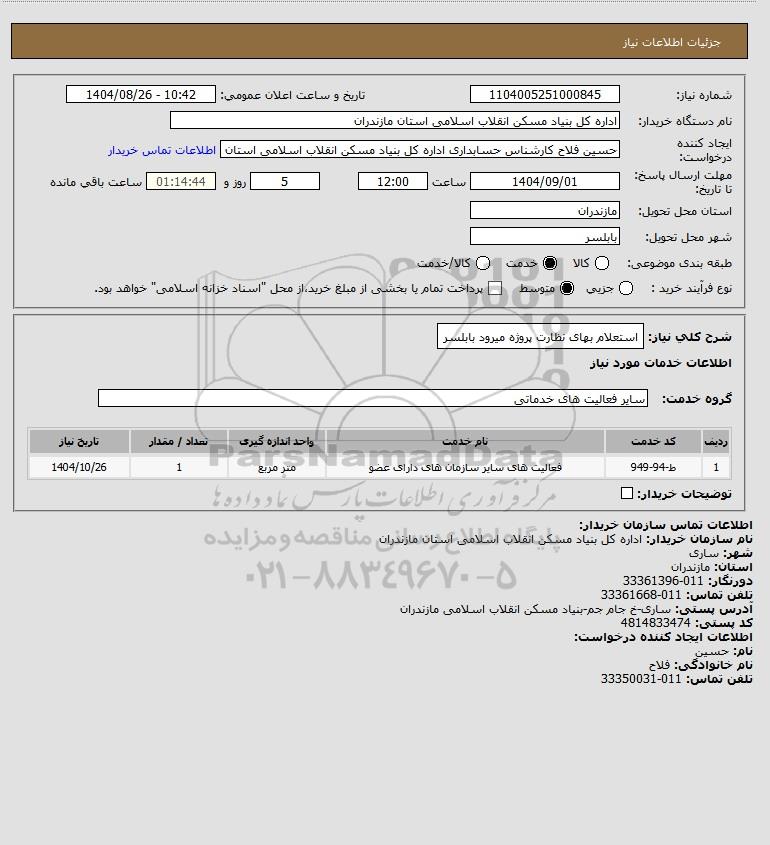 شرح کلی نیاز: استعلام بهای نظارت پروژه میرود بابلسر