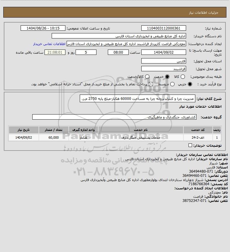 شرح کلی نیاز: مدیریت چرا و کنترل پروانه چرا به مساحت 60000 هکتار-مبلغ پایه 2750 م.ر.