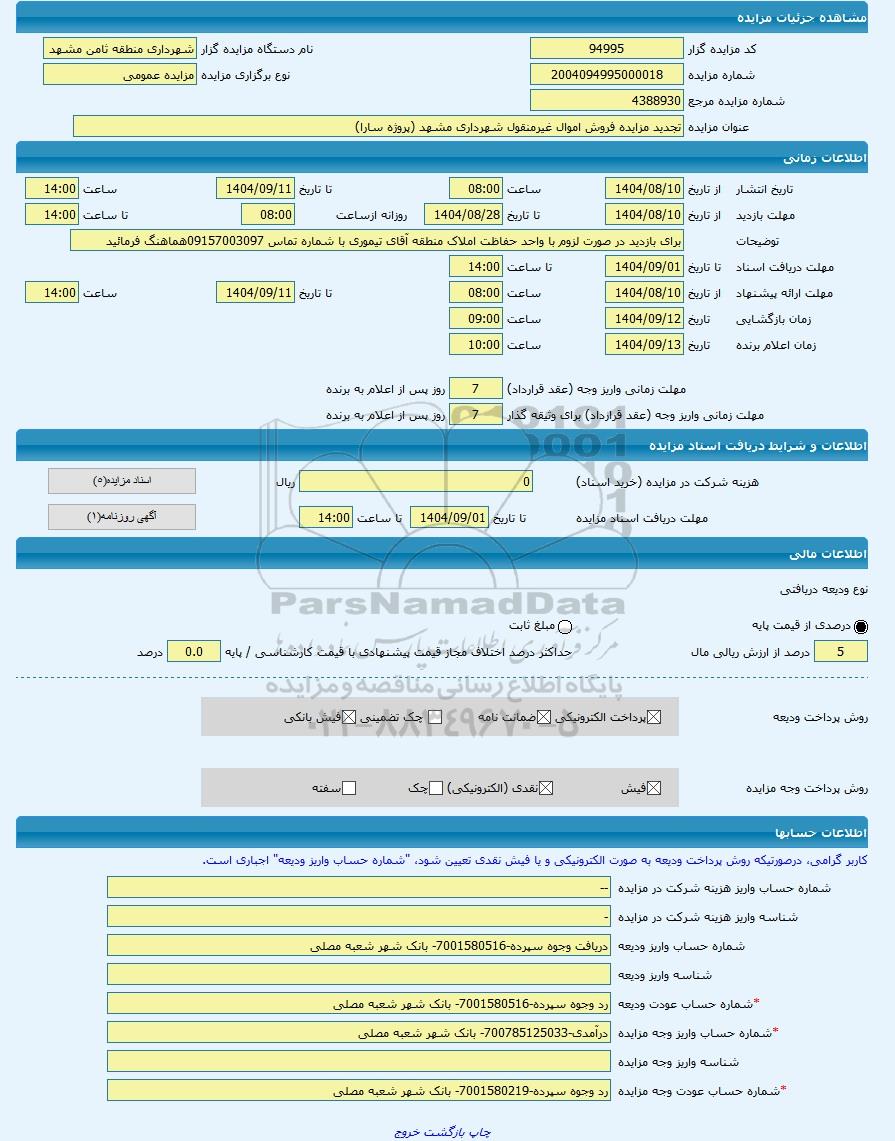 | عنوان مزایده | تجدید مزایده فروش اموال غیرمنقول شهرداری مشهد (پروژه سارا) -مزایده آپارتمان - استان خراسان رضوی | |||
