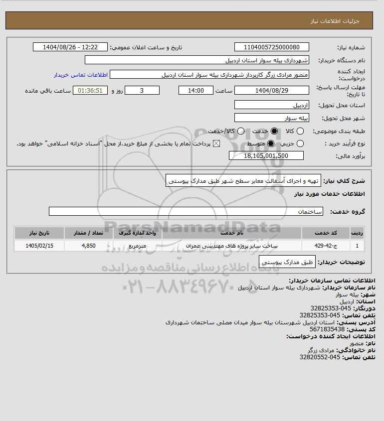 استعلام بها و موضوع استعلام استعلام تهیه و اجرای آسفالت معابر سطح شهر طبق مدارک پیوستی به اطلاع کلیه شرکتها و افراد متخصص واجد شرایط میرساند، آگهی گذار در نظر دارد از طریق استعلام بها، نسبت به انتخاب و دریافت پیشنهادات اقدام نماید. این استعلام با کد آگهی ثبت شده در سامانه خبرگزاری پارس نماد : 9865597 منتشر شده است. مشخصات استعلام : تاریخ شروع استعلام: 1404/08/26 آخرین مهلت ارسال پیشنهاد قیمت : 1404/08/29 و محل اجرای پروژه : استان اردبیل میباشد. استعلام قیمت مورد درخواست : استعلام تهیه و اجرای آسفالت معابر سطح شهر طبق مدارک پیوستی با دستهبندیهای تخصصی و گروه های مرتبط : راهسازی, آسفالت, ساختمان, استعلام اطلاع رسانی میگردد.
