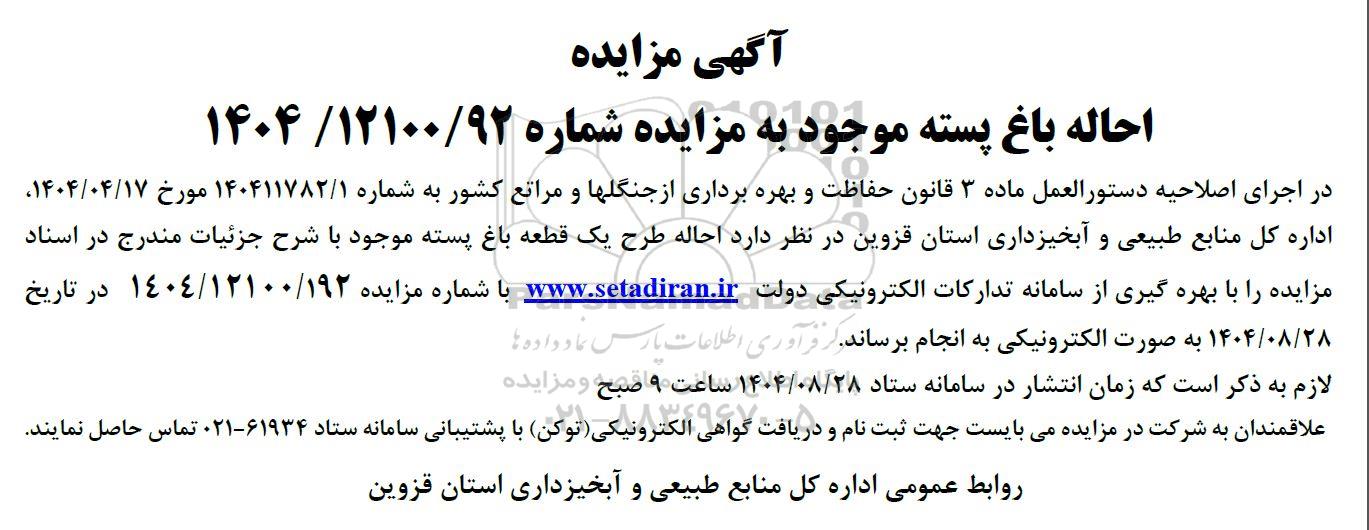 اداره کل منابع طبیعی و آبخیزداری استان قزوین در نظر دارد احاله طرح یک قطعه باغ پسته موجود با شرح جزئیات مندرج در اسناد مزایده را با بهره گیری از سامانه تدارکات الکترونیکی دولت ستاد ایران با شماره مزایده 1404/12100/192 در تاریخ 1404.8.28 به صورت الکترونیکی به انجام برساند.