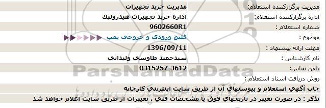 استعلام بها و موضوع استعلام استعلام, استعلام فلنچ ورودی و خروجی پمپ به اطلاع کلیه شرکتها و افراد متخصص واجد شرایط میرساند، آگهی گذار در نظر دارد از طریق استعلام بها، نسبت به انتخاب و دریافت پیشنهادات اقدام نماید. این استعلام با کد آگهی ثبت شده در سامانه خبرگزاری پارس نماد : 986581 منتشر شده است. مشخصات استعلام : تاریخ شروع استعلام: 1396/09/08 آخرین مهلت ارسال پیشنهاد قیمت : 1396/09/11 و محل اجرای پروژه : استان اصفهان میباشد. استعلام قیمت مورد درخواست : استعلام, استعلام فلنچ ورودی و خروجی پمپ با دستهبندیهای تخصصی و گروه های مرتبط : الکتروموتور و پمپ های شناور, لوله و اتصالات, استعلام اطلاع رسانی میگردد.