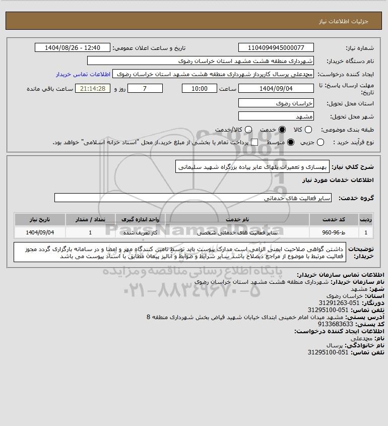 شرح کلی نیاز: بهسازی و تعمیرات پلهای عابر پیاده بزرگراه شهید سلیمانی