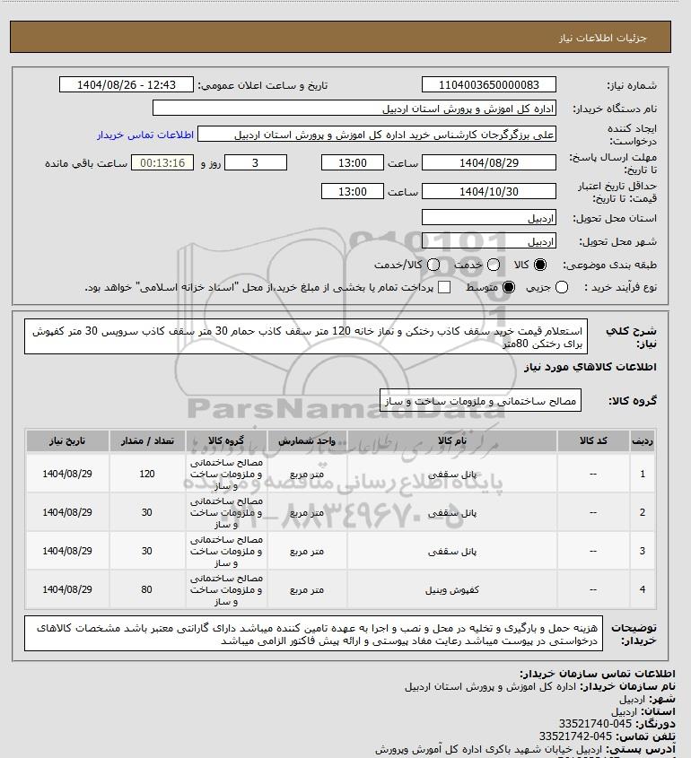 شرح کلی نیاز: استعلام قیمت خرید سقف کاذب رختکن و نماز خانه 120 متر سقف کاذب حمام 30 متر سقف کاذب سرویس 30 متر کفپوش برای رختکن 80متر