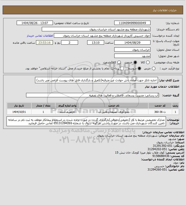 شرح کلی نیاز: اجاره تانکر جهت آماده باش حوادث غیر مترقبه(تکمیل و بارگذاری فایل های پیوست الزامی می باشد)