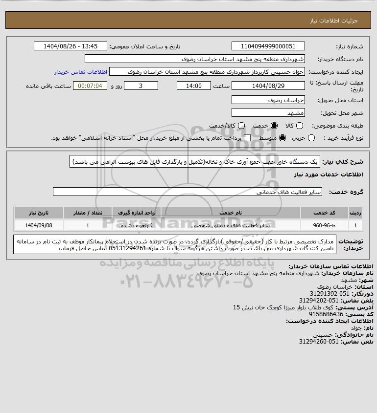 شرح کلی نیاز: یک دستگاه خاور جهت جمع آوری خاک و نخاله(تکمیل و بارگذاری فایل های پیوست الزامی می باشد)
