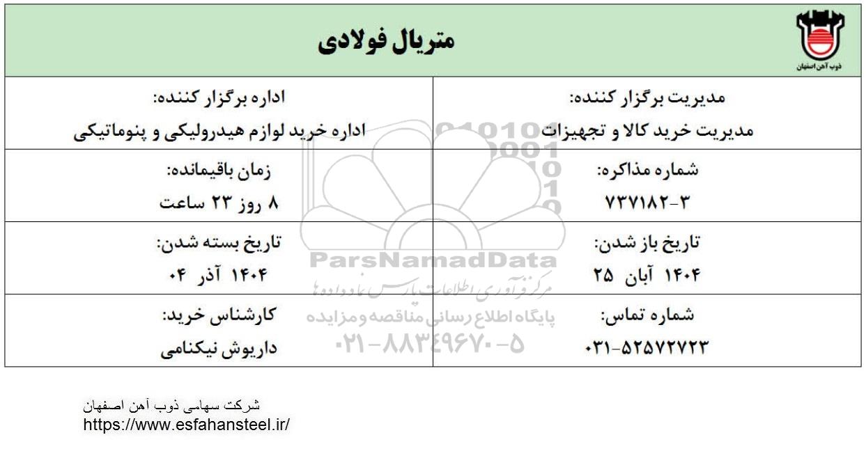 استعلام بها و موضوع استعلام استعلام متریال فولادی به اطلاع کلیه شرکتها و افراد متخصص واجد شرایط میرساند، آگهی گذار در نظر دارد از طریق استعلام بها، نسبت به انتخاب و دریافت پیشنهادات اقدام نماید. این استعلام با کد آگهی ثبت شده در سامانه خبرگزاری پارس نماد : 9866535 منتشر شده است. مشخصات استعلام : تاریخ شروع استعلام: 1404/08/26 آخرین مهلت ارسال پیشنهاد قیمت : 1404/09/04 و محل اجرای پروژه : استان مناقصات استان اصفهان میباشد. استعلام قیمت مورد درخواست : استعلام متریال فولادی با دستهبندیهای تخصصی و گروه های مرتبط : ساخت،نصب و تعمیرات صنایع فولاد, قطعات چدنی و فولادی, تجهیزات و ماشین آلات صنعتی, استعلام اطلاع رسانی میگردد.