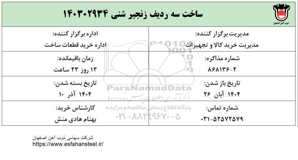 استعلام بها و موضوع استعلام استعلام ساخت سه ردیف زنجیر شنی به اطلاع کلیه شرکتها و افراد متخصص واجد شرایط میرساند، آگهی گذار در نظر دارد از طریق استعلام بها، نسبت به انتخاب و دریافت پیشنهادات اقدام نماید. این استعلام با کد آگهی ثبت شده در سامانه خبرگزاری پارس نماد : 9866666 منتشر شده است. مشخصات استعلام : تاریخ شروع استعلام: 1404/08/26 آخرین مهلت ارسال پیشنهاد قیمت : 1404/09/10 و محل اجرای پروژه : استان مناقصات استان اصفهان میباشد. استعلام قیمت مورد درخواست : استعلام ساخت سه ردیف زنجیر شنی با دستهبندیهای تخصصی و گروه های مرتبط : زنجیر صنعتی, ساخت،نصب و تعمیرات صنایع فولاد, تجهیزات و ماشین آلات صنعتی, استعلام اطلاع رسانی میگردد.