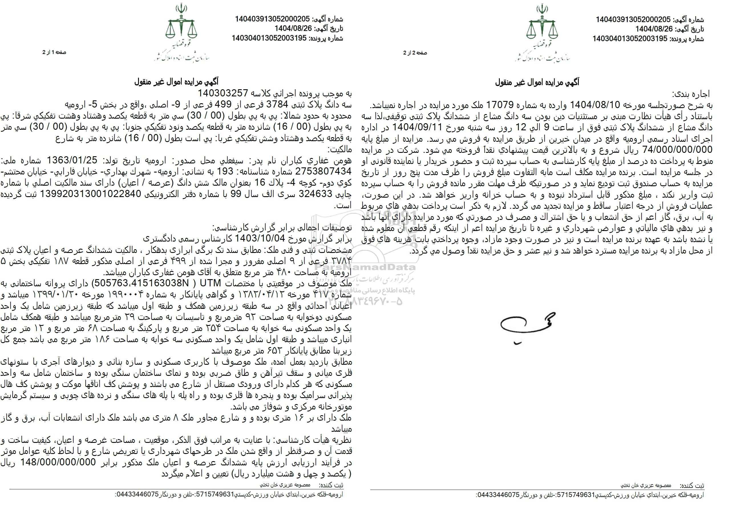 به شرح صورتجلسه مورخه 1404.08.10 وارده به شماره 17079 ملک مورد مزایده در اجازه نمیباشد. باستناد رای هیات نظارت مبنی بر مستثنیات دین بودن سه دانگ مشاع از ششدانگ پلاک ثبتی توقیفی، لذا سه دانگ مشاع از ششدانگ پلاک ثبتی فوق از ساعت 9 الی 12 روز سه شنبه مورخ 1404.09.11 در اداره اجرای اسناد رسمی ارومیه واقع در میدان خیرین از طریق مزایده به فروش میرسد. مزایده از مبلغ پایه 74.000.000.000 ریال شروع و به بالاترین قیمت پیشنهادی نقداً فروخته می شود شرکت در مزایده مالکیت منوط به پرداخت ده درصد از مبلغ پایه کارشناسی به حساب سپرده ثبت و حضور خریدار با نماینده قانونی او در جلسه مزایده است. برنده مزایده مکلف است ما به التفاوت مبلغ فروش را ظرف مدت پنج روز از تاریخ مزایده به حساب صندوق ثبت تودیع نماید و در صورتیکه ظرف مهلت مقرر مانده فروش را به حساب سپرده ثبت واریز نکند، مبلغ مذکور قابل استرداد نبوده و به حساب خرانه واریر خواهد شد. در این صورت عملیات فروش از درجه اعتبار ساقط و مزایده تجدید میگردد. لازم به ذکر است پرداخت بدهی های مربوط است. به آب برق گاز اعم از حق انشعاب و با حق اشتراک و مصرف در صورتی که مورد مزایده دارای آنها باشد. و نیر بدهی های مالیاتی و عوارض شهرداری و غیره تا تاریخ مزایده اعم از اینکه رقم قطعی آن معلوم شده با نشده باشد به عهده برنده مزایده است و نیز در صورت وجود مازاد وجوه پرداختی بابت هزینه های فوق از محل مازاد به برنده مزایده مسترد خواهد شد و نیم عشر و حق مزایده نقدا وصول می گردد.