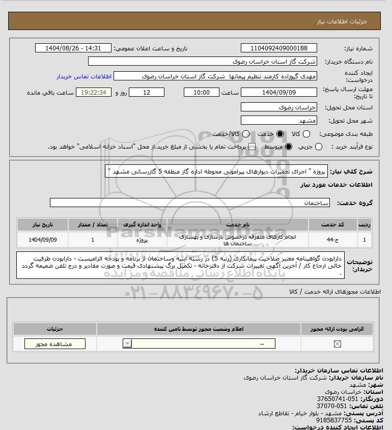 شرح کلی نیاز: پروژه " اجرای تعمیرات دیوارهای پیرامونی محوطه اداره گاز منطقه 5 گازرسانی مشهد "