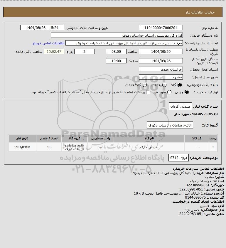 | 1 | -- | صندلی اداری | عدد | اثاثیه، مبلمان و تزیینات دکوری | 10 | 1404/09/01 |