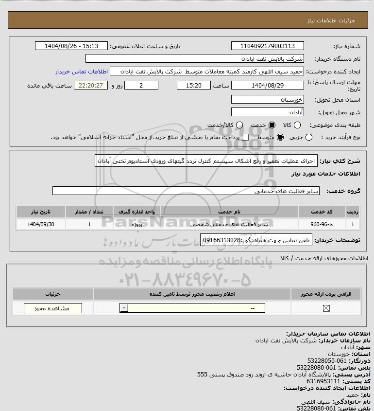 شرح کلی نیاز: اجرای عملیات تعمیر و رفع اشکال سیستم کنترل تردد گیتهای ورودی استادیوم تختی آبادان