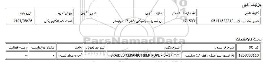 | ناصر امان آبادی - 05141522310 | 171503 | نخ نسوز سرامیکی قطر 17 میلیمتر | استعلام الکترونیکی | 1404/08/26 |
