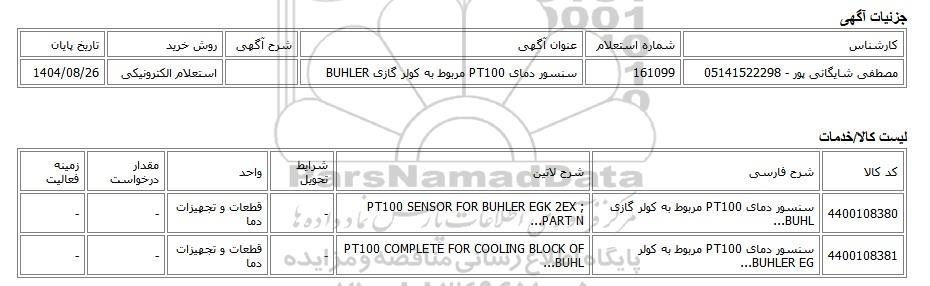 | مصطفی شایگانی پور - 05141522298 | 161099 | سنسور دمای PT100 مربوط به کولر گازی BUHLER | استعلام الکترونیکی | 1404/08/26 |