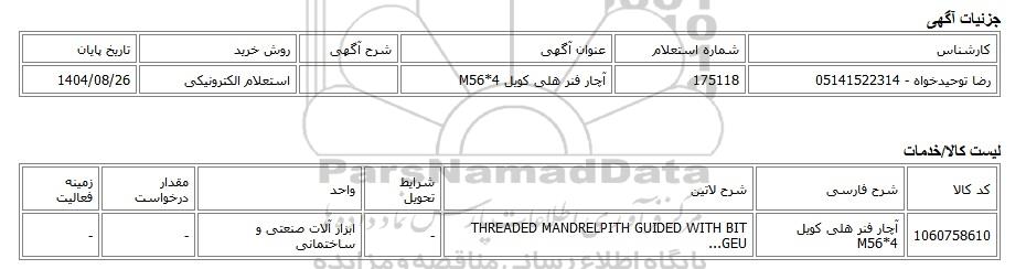 | رضا توحیدخواه - 05141522314 | 175118 | آچار فنر هلی کویل M56*4 | استعلام الکترونیکی | 1404/08/26 |