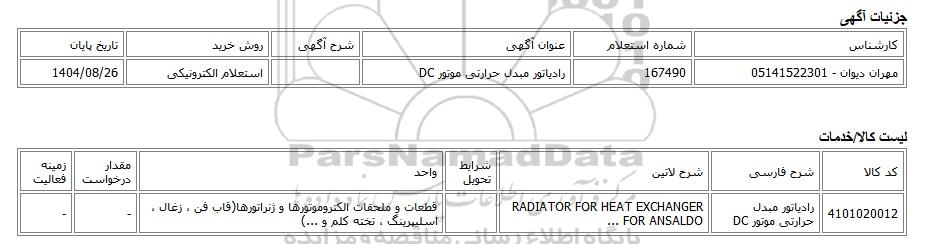 | مهران دیوان - 05141522301 | 167490 | رادیاتور مبدل حرارتی موتور DC | استعلام الکترونیکی | 1404/08/26 |