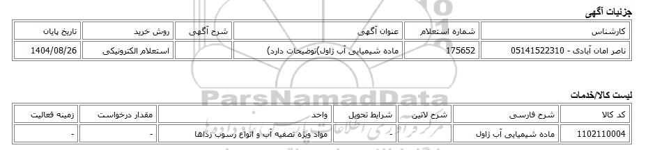 | ناصر امان آبادی - 05141522310 | 175652 | ماده شیمیایی آب ژاول)توضیحات دارد) | استعلام الکترونیکی | 1404/08/26 |
