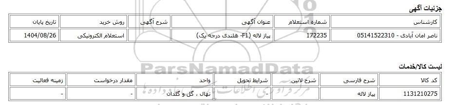 | ناصر امان آبادی - 05141522310 | 172235 | پیاز لاله (F1- هلندی درجه یک) | استعلام الکترونیکی | 1404/08/26 |