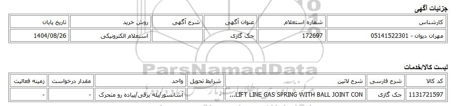 | مهران دیوان - 05141522301 | 172697 | جک گازی | استعلام الکترونیکی | 1404/08/26 |