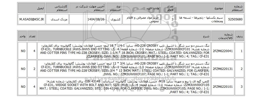 | 2 | 2FZM6220131 | تنگ دستی-دو سر شگل با اشپیل تایپ HG-228 CROSBY؛ سایز: 3/4 * 12 اینچ؛ جنس: فولادی؛ پوشش: گالوانیزه؛ برای کلاریفایر؛ شماره نقشه: ZZM3UW00CF107؛ شماره صفحه: 1-1؛ شماره قطعه: 1؛ تگ: CF-E31, TURNBUCKLE JAWS-JAWS END FITTING AND COTTER PINS TYPE HG-228 CROSBY; SIZE: 3/4 * 12 INCH; MAT.: STEEL; COATED: GALVANIZED; FOR CLARIFIER; DWG. NO.: ZZM3UW00CF107; PAGE NO.: 1-1; PART NO.: 1; TAG.: CF-E31, | 2 | NO |