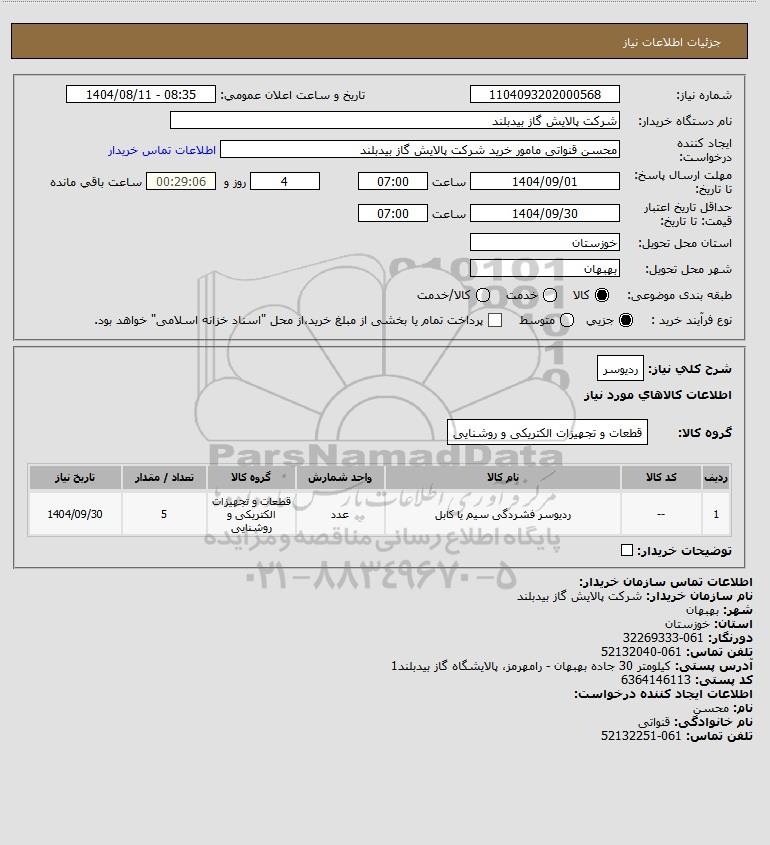 | 1 | -- | ردیوسر فشردگی سیم یا کابل | عدد | قطعات و تجهیزات الکتریکی و روشنایی | 5 | 1404/09/30 |