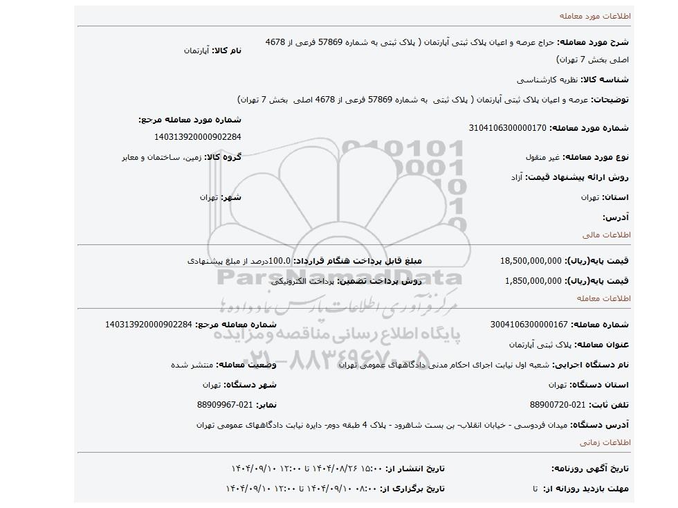 مزایده، عرصه و اعیان پلاک ثبتی آپارتمان ( پلاک ثبتی  به شماره 57869 فرعی از 4678 اصلی  بخش 7 تهران)