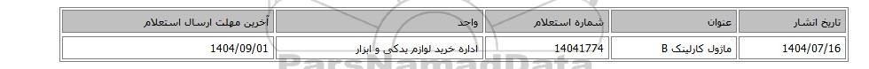 | 1404/07/16 | ماژول کارلینک B | 14041774 | اداره خرید لوازم یدکی و ابزار | 1404/09/01 |